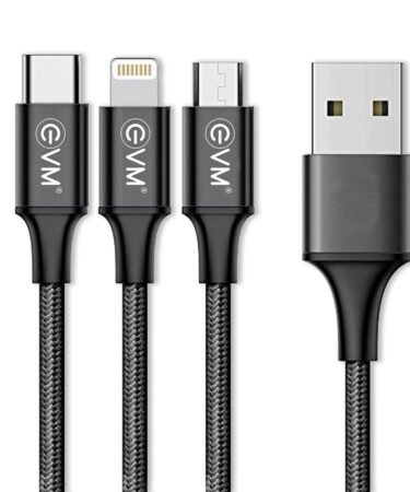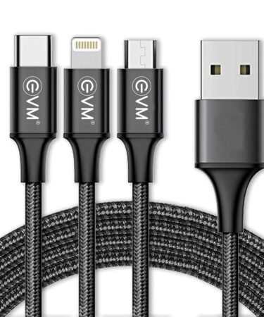 EVM 3in-1 Nylon Braided Smart Charging Cable for Android & iPhone – Micro USB, Type-C, 8 Pin(L) – Tangle-Free, 10,000+ Bend- Black – 1 Year Warranty (EVM-M3-Black)