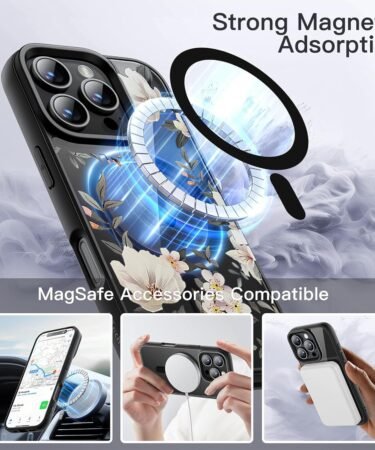 VONZEE Compatible with iPhone 15 Pro Max Case Luxury Retro Flowers Floral Clear for Magnetic Wireless Charging Case Shockproof Case PC+TPU Cute Glossy Shiny Cover for Girls Women, 6.7” Black