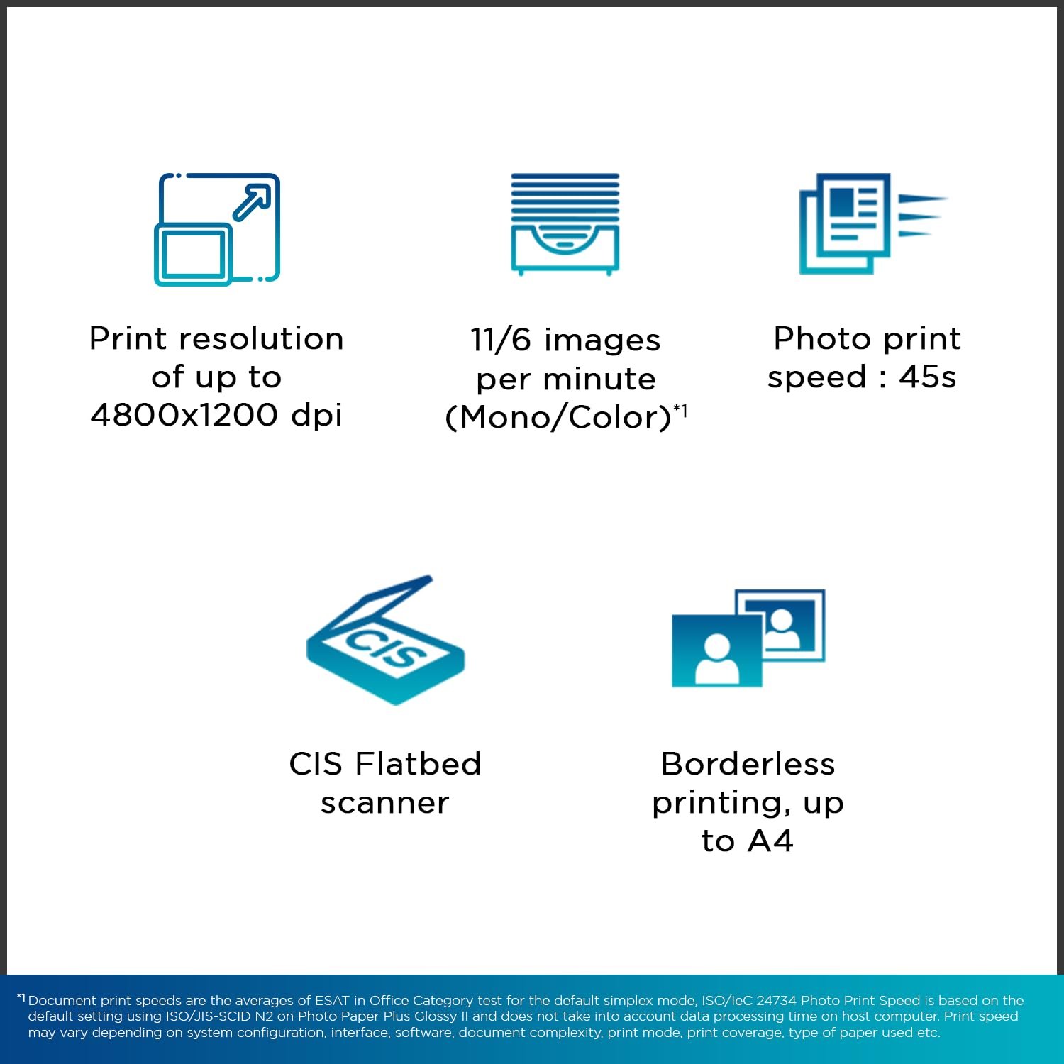 • Page size: A4, A5, A6, B5, LTR, LGL, Executive, Oficio2, B-Oficio, M-Oficio, Legal (India), Foolscap, F4, 4 x 6″, 5 x 7″, 7 x 10″, 8 x 10″, Envelopes , Square, Card Size ,Custom Size- Width: 55 – 216 mm, Length: 89 – 1,200 mm; Max paper thickness: 64 to 275 GSM ; Maximum Input Sheet Capacity: 100 sheets (A4); Compatible ink:GI 71 Cyan, Magenta, Yellow, Black; Additional Printer Function:, Print modes- Standard and Economy ; Power wattage of printer: OFF: 0.1W, Standby (scanning lamp is off):0.6W, Copying (USB connection to PC): 16W