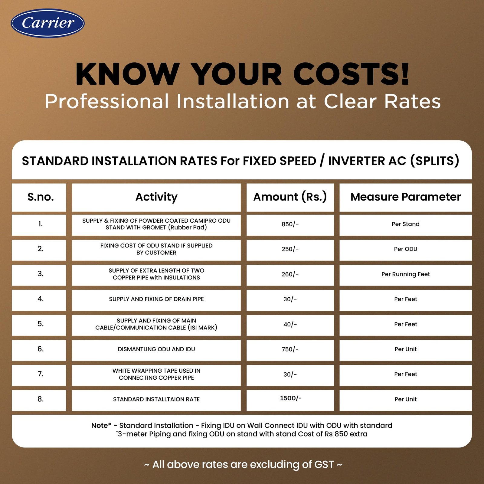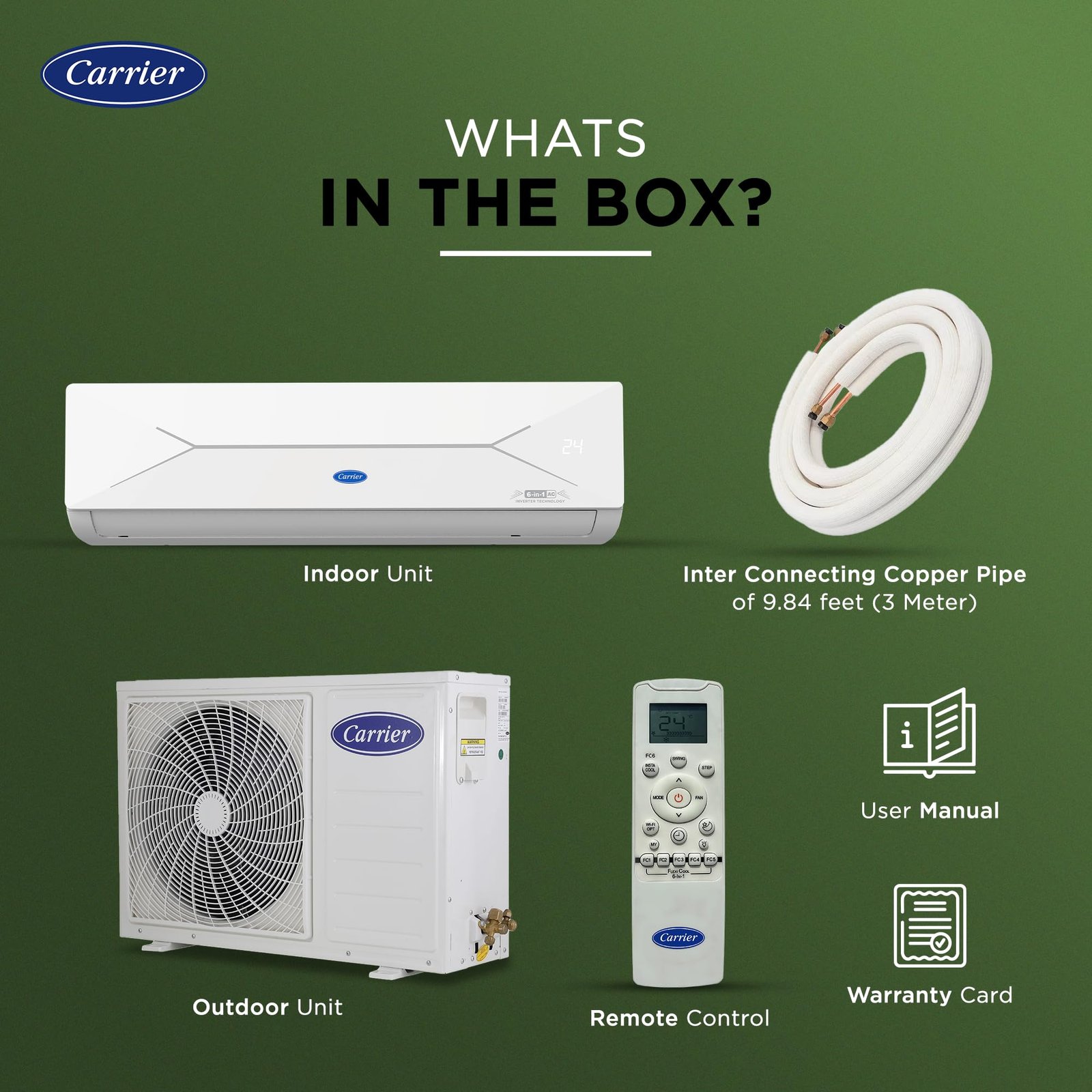 • Included in the box: Indoor Unit, Outdoor Unit, Inter Connecting Copper Pipe of 9.84 feet( 3 Meter), Remote Control, User manual, Warranty Card