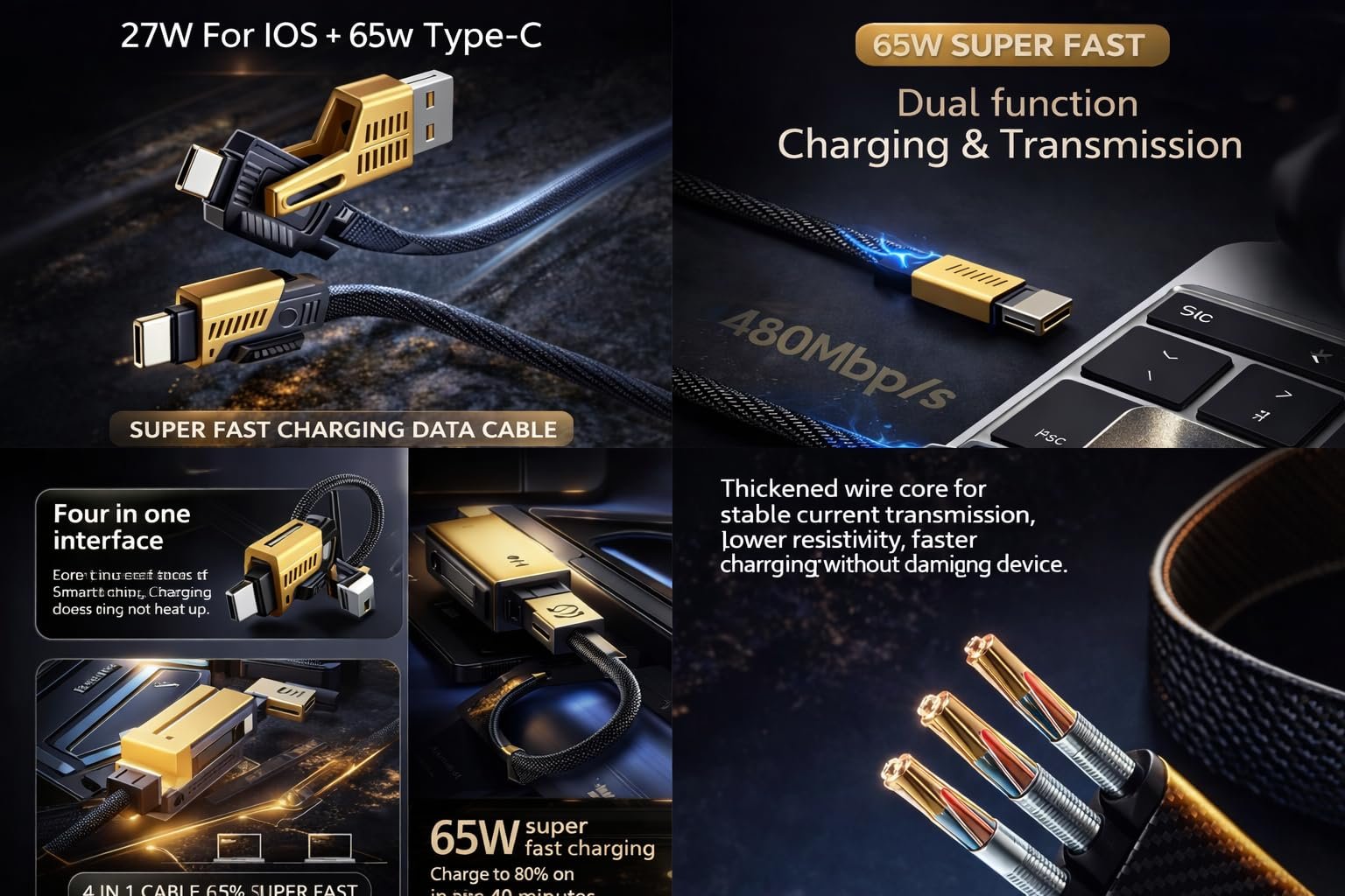 Details: This versatile 4 in 1 multi-charging cable is the ultimate solution for powering all your devices with a single cable. Featuring dual Type-C connectors, USB-A, and Lightning compatibility, this cable eliminates the need to carry multiple chargers, making it perfect for home, office, travel, and car use. With an impressive 65W super fast charging capability for Type-C devices and 27W PD fast charging for iOS devices, you can charge your smartphone to 60% in just 30 minutes and reach 80% in 40 minutes. The cable also supports blazing-fast data transmission speeds of up to 480Mbps, allowing you to transfer files quickly and efficiently. Built with a smart chip technology, the cable ensures safe charging without overheating, protecting your devices from damage. The durable braided design provides enhanced longevity and tangle resistance, whilst the distinctive gold and black connectors make it easy to identify the right port for each device. Whether you need to charge your laptop, tablet, smartphone, or other USB-powered devices, this 4 in 1 cable delivers exceptional performance and convenience. Say goodbye to cable clutter and enjoy the freedom of charging multiple devices simultaneously with this innovative all-in-one charging solution.