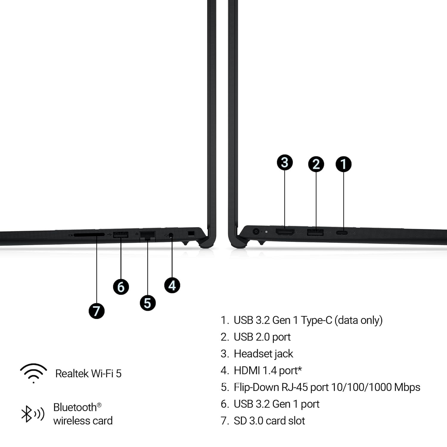 • Ports: 1 USB 2.0 port, 1 Headset jack, 1 HDMI 1.4 port*, 1 Flip-Down RJ-45 port 10/100/1000 Mbps, 1 SD 3.0 card slot, 1 USB 3.2 Gen 1 port, USB 3.2 Gen 1 Type-C (data only)