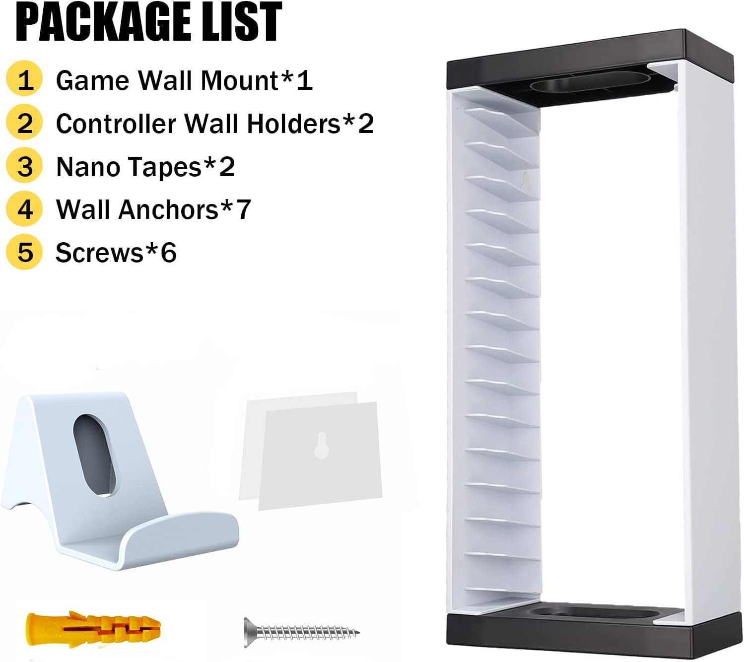 - Package includes wall mounted game disc tower, 2 x controller wall mounts, 7 wall anchors, 6 screws, 2 adhesive pads. Drill and 7mm drill bit required for video game stand installation.