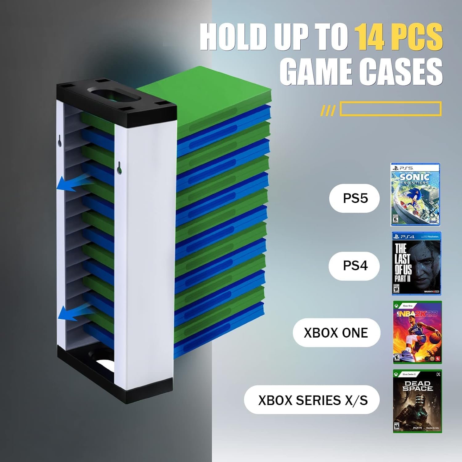 - Video game storage tower and 2 universal controller holders. Hold up to 14 games and 2 controllers. Compatible with Playstation PS5, PS4, PS3, Xbox One and Xbox Series X controllers and game discs.