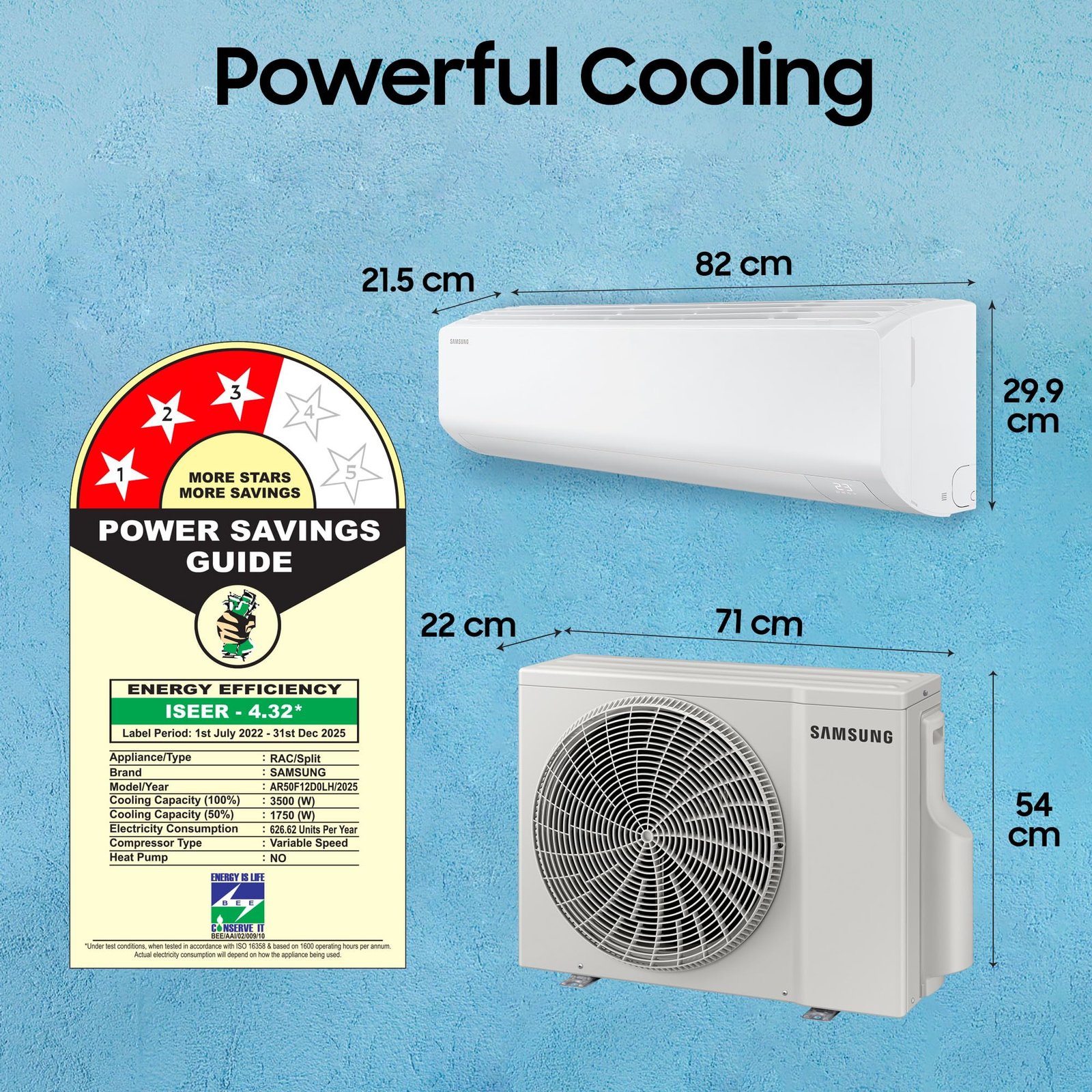Samsung 1 Ton 3 Star Digital Inverter Split AC (Faster & Powerful Cooling even at 58 Degree C, 100% Copper, 5 year comprehensive warranty, 5 Step Convertible, AR50F12D0LHNNA, White)